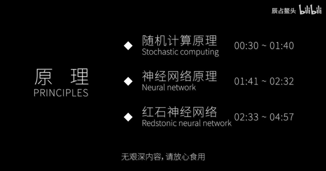 up 主辰占鳌头特地额外附赠了一个视频来给大家讲解红石神经网络的原理,并在开头就贴心地提醒观众: “无艰深内容,请放心食用” 。