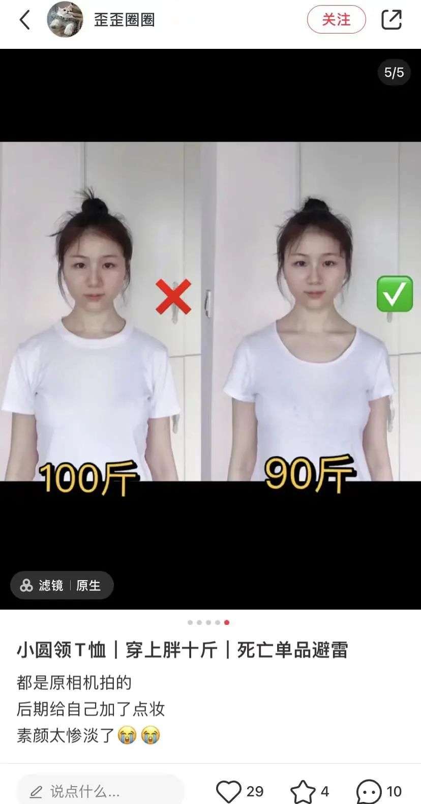 不过,对于肩膀略宽或者肩背相对不那么薄的人,小圆领就没有那么友好了,贴颈圆领简直是“显肿神器”,一穿上身视觉增重十斤。