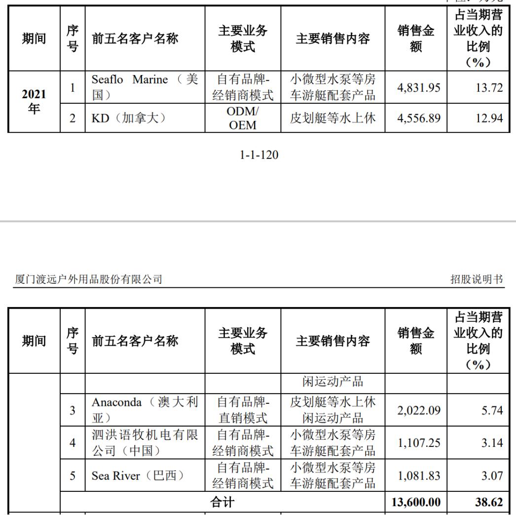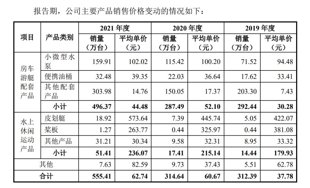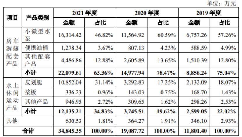 渡远户外的两大拳头产品分别为“小微型水泵”和“皮划艇”,2021年,两大产品分别营收1.63亿元及1.08亿元。