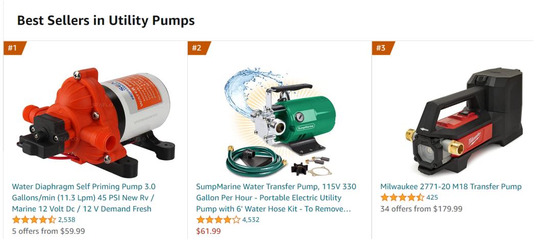 在亚马逊上,多款船用水泵长期位于亚马逊畅销产品之列。其中,一款水泵位列“Utility Pumps”类目中的Bestsellers第一名。