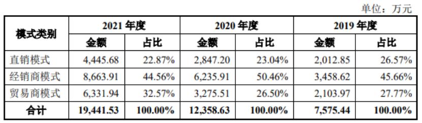 其中,经销商模式销售收入最高,2021年营收为8663万,占比44%,其次是贸易商模式,营收6331万,占比33%,营收最低的是直销模式,销售收入仅为4446万。