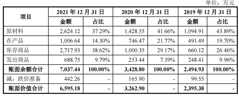 但是,存货跌价准备金额并不高,2021年的跌价准备金为442万,占存货账面余额的6.28%;主要是公司产品毛利率相对较高,存货按照成本与可变现净值计量,发生减值的金额较少。