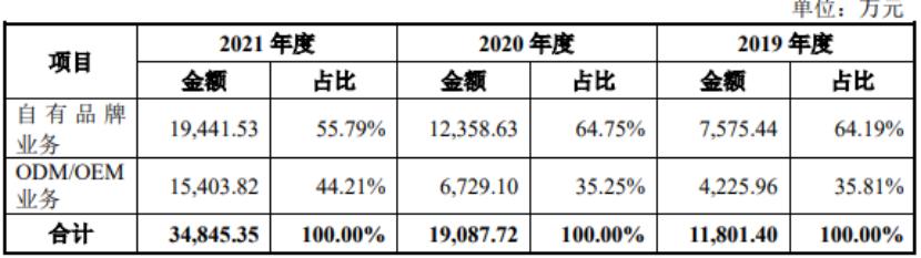 ODM/OEM在2020年营收为6729万,占比35%。到了2021年营收1.5亿元,营收占比上升至44%。