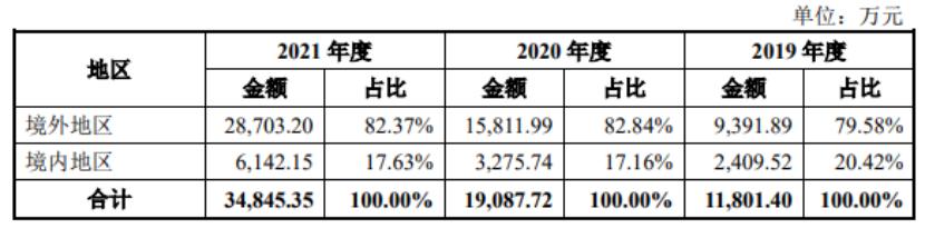渡远户外的营收,八成以上来自于海外市场。2019年至2021,境外收入分别为 9391万元、1.58亿元和 2.9亿元,占总营收均超过80%。相比之下,2021年境内收入6142万元,占比仅为18%。