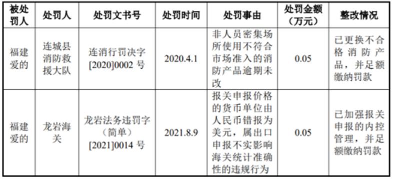 值得注意的是,渡远户外子公司福建爱的在近两年内,分别有两项行政处罚记录。一项是消防产品不符合要求,逾期未整改罚单,一份是海关出具的申报不实违规行为罚单。