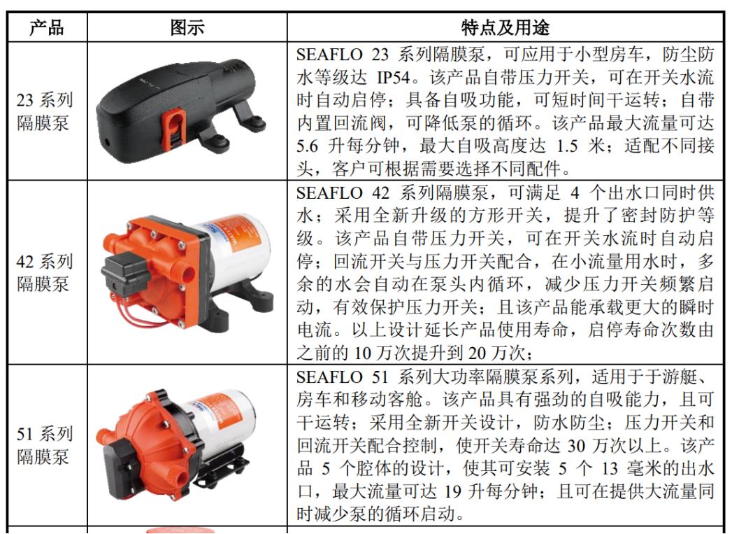 这类隔膜泵主要用于小型房车、游艇、移动客仓等,其中几款启停寿命次数为20万次。