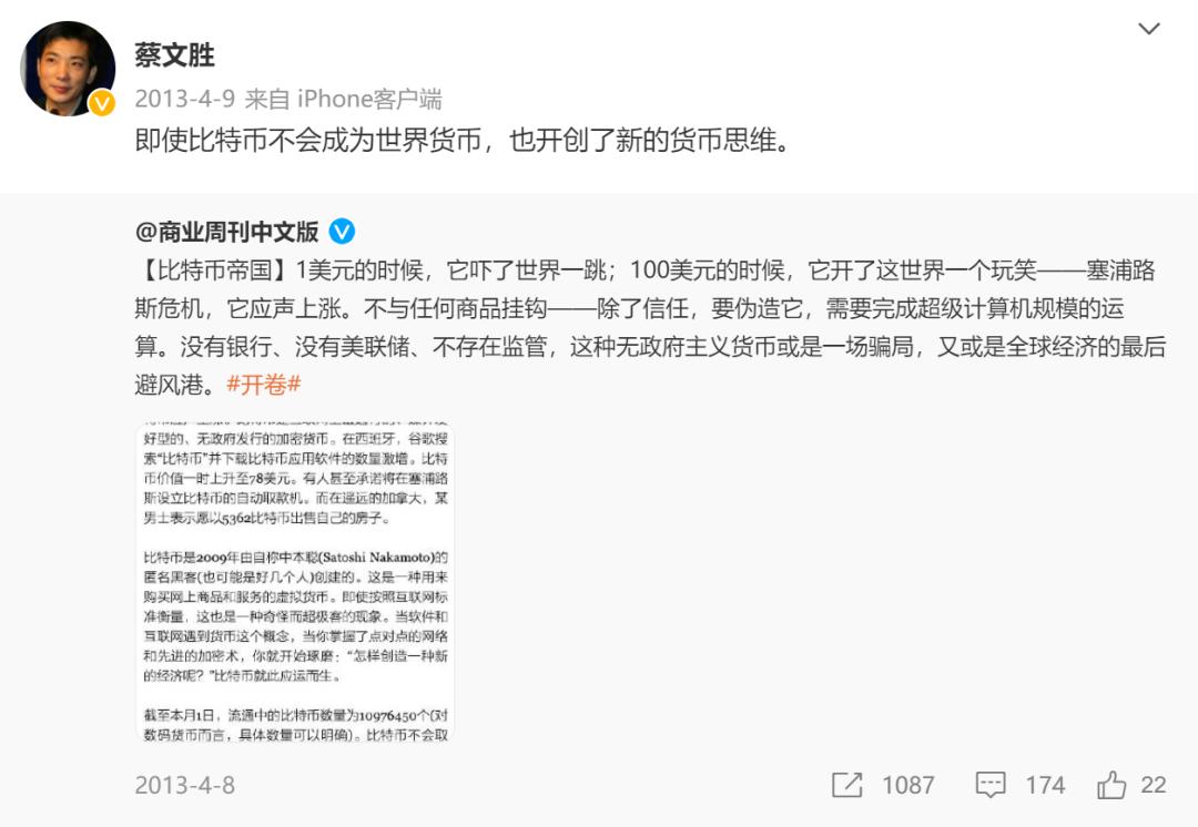 早在2013年,蔡文胜就在微博上公开表示看好比特币。