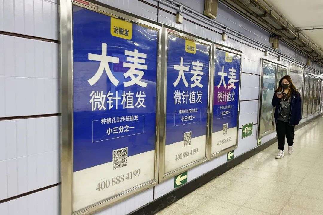 植发曾经是一个相对小的市场,甚至于植发的广告都只会出现在城市的各个角落。但随着大大小小植发机构的出现,“脱发焦虑,植发根治”类似的营销也越来越多地出现在电梯、写字楼、短视频平台甚至是地铁上,循环播放的植发广告直击消费人群。