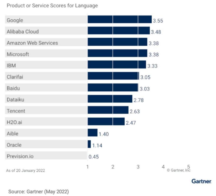 据Gartner发布的2022年度《云AI开发者服务关键能力报告》,阿里、腾讯分别位列语言AI与视觉AI全球第二,与两项第一名的谷歌各相差0.7分、0.4分。在语言类别下,百度、腾讯也进入前十。