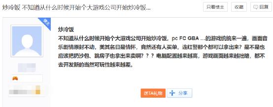 因此,并不是所有玩家都对重制版游戏充满期待,比起看到一款老游戏被翻新重制,不少玩家还是更希望能厂商能推出和过去不一样的新品。对他们而言,厂商炒冷饭并不是一件值得高兴的事情,更有甚者直接表示这就是不思进取的表现。