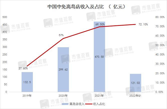 招股书显示,2019年-2021年,公司离岛店收入从132.5亿元攀升至470.58亿元,收入占比从27.6%升至69.5%,并于今年一季度首次超过70%。