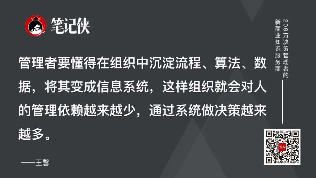 因此,管理者要懂得在组织中沉淀流程、算法、数据,将其变成信息系统,这样组织就会对人的管理依赖越来越少,通过系统做决策越来越多。
