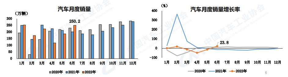 中汽协今天公布的数据显示,6月,汽车产销分别达到249.9万辆和250.2万辆,环比增长29.7%和34.4%,同比增长28.2%和23.8%,结束了下降趋势。