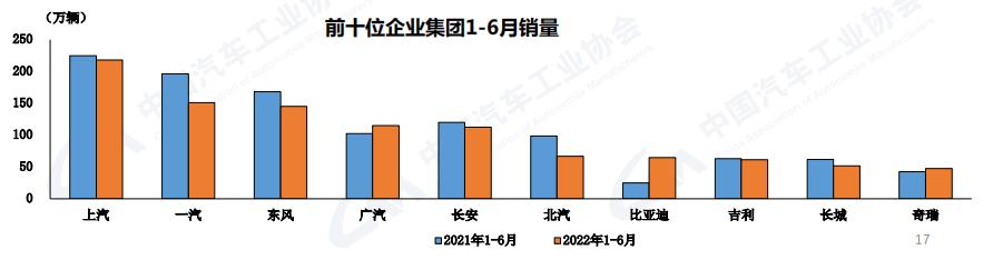 1-6月,汽车销量排名前十位的企业(集团)共销售1034.3万辆,占汽车销售总量的85.8%。在汽车销量排名前十位企业中,与上年同期相比,比亚迪销量增速依然最为明显,广汽和奇瑞呈较快增长,其他企业依然呈一定下降。