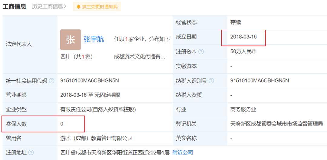 发现这家公司成立时间非常短,成立于 2018 年,注册资本 50 万,实缴资本为 0 ,并且成立四年,每年年报都显示参保人数为 0 。
