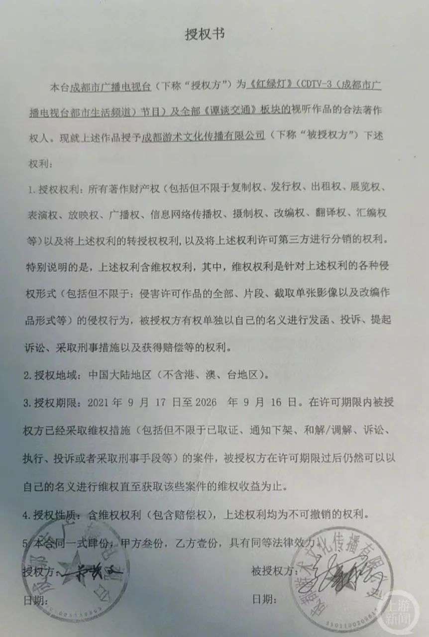 电视台官方回应称已将《 谭谈交通 》所有著作财产权以及相关权利转授给了游术,协议中特别注明了包含赔偿权。