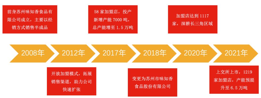 - 2021年4月27日,味知香在上海证券交易所正式上市,成为第一家A股半成品菜上市公司,公司主营产品品类是即烹食品。