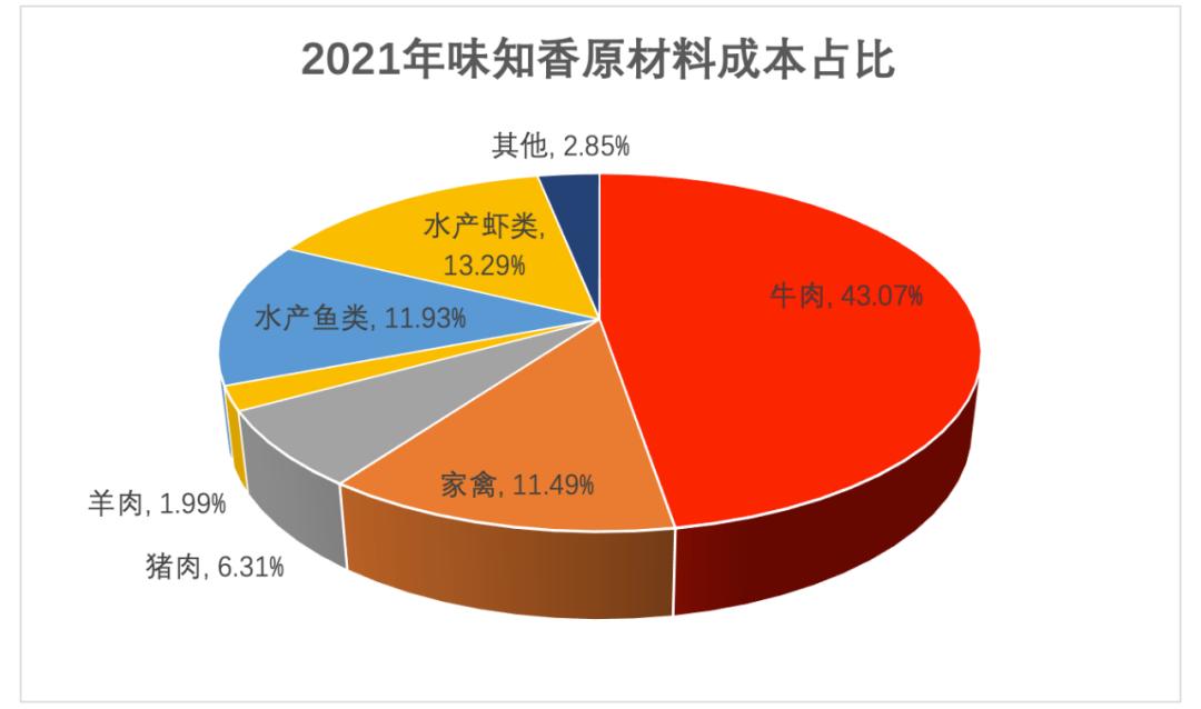 味知香2021年年报显示,原 材料成本占主营业务成本的90.93%,其中肉禽类成本占比62.86%,鱼虾类占比25.22%。 味知香采购的家禽类细分品种较多,其中占比较大的鸡大胸采购价格与农业部发布的白条鸡批发价相比,基本都低于市场价。
