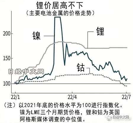 纯电动汽车(EV)电池使用的有色金属的价格出现两极分化。主要原料锂的价格比2021年底上涨7成,镍和钴的价格浮动却不大。中国正在让多种车辆采用不需要使用镍等的电池,纯电动汽车的需求结构发生变化。由于锂的供应迟迟无法增加。电池金属争夺战在脱碳化背景下愈演愈烈。锂正在逐步成为电池金属的关键。