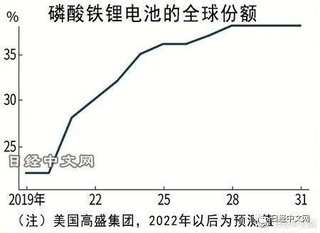 磷酸铁锂电池的价格比三元锂电池便宜2成,同时被认为安全性高。在纯电动汽车销量占全球约一半的中国,“目前采用磷酸铁锂电池的比例已经达到近60%”(一家大型商社的电池金属负责人)。特斯拉也决定在主力车型“Model 3”上采用磷酸铁锂电池。目前,磷酸铁锂电池在全球纯电动汽车用电池中所占的份额为25%~30%,但据美国高盛集团(Goldman Sachs)预测,到2030年份额将上升至近40%。