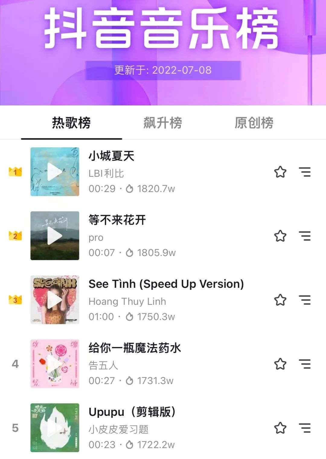 在7月8日更新的抖音热歌榜单中,前5首热门BGM中,有4首的时长都在30秒之内。