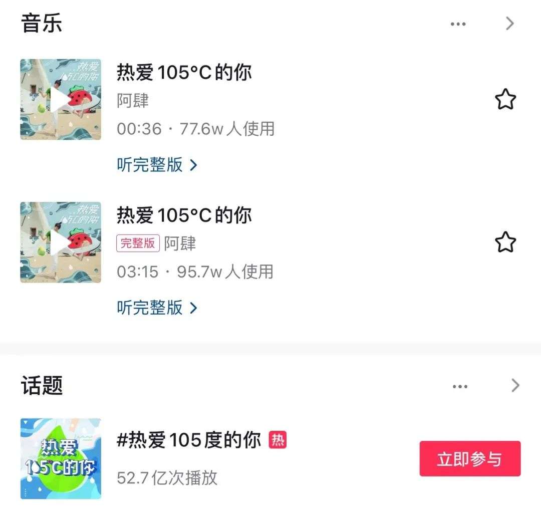 这首《热爱105℃的你》是歌手阿肆在2019年为屈臣氏蒸馏水定制的一首广告歌,时隔两年走红抖音,再次给品牌带来曝光。