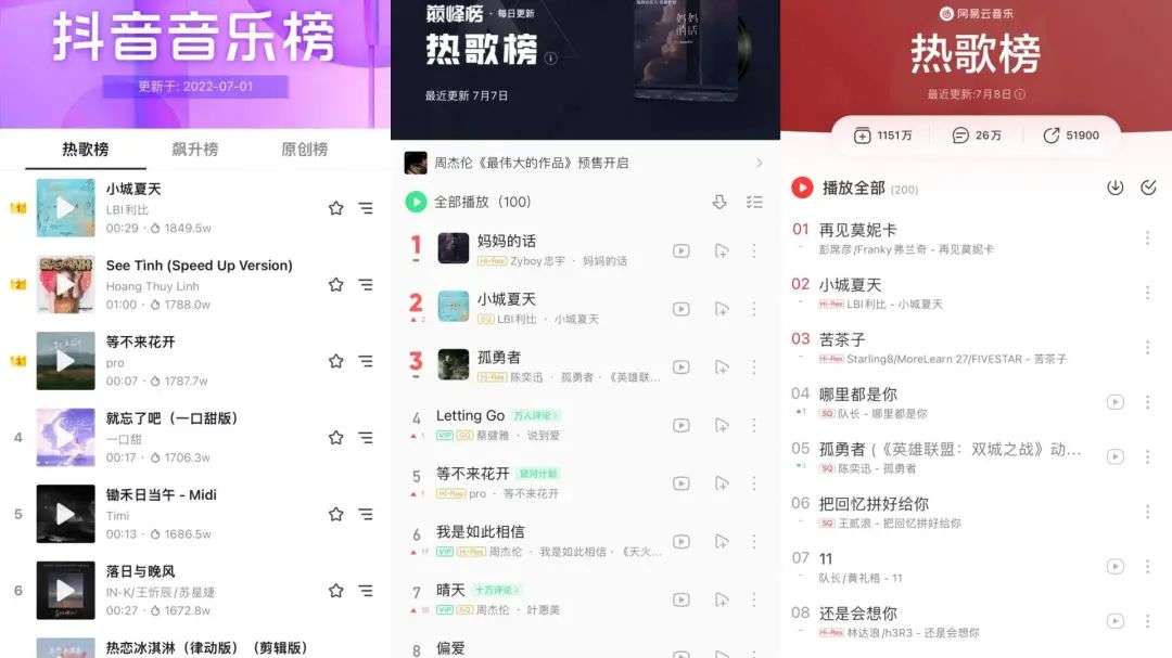 对比抖音与QQ音乐、网易云音乐的热歌榜单,可以发现进入前5名的重合歌曲寥寥无几,抖音热曲对于整个音乐平台的影响力似乎正在衰减。