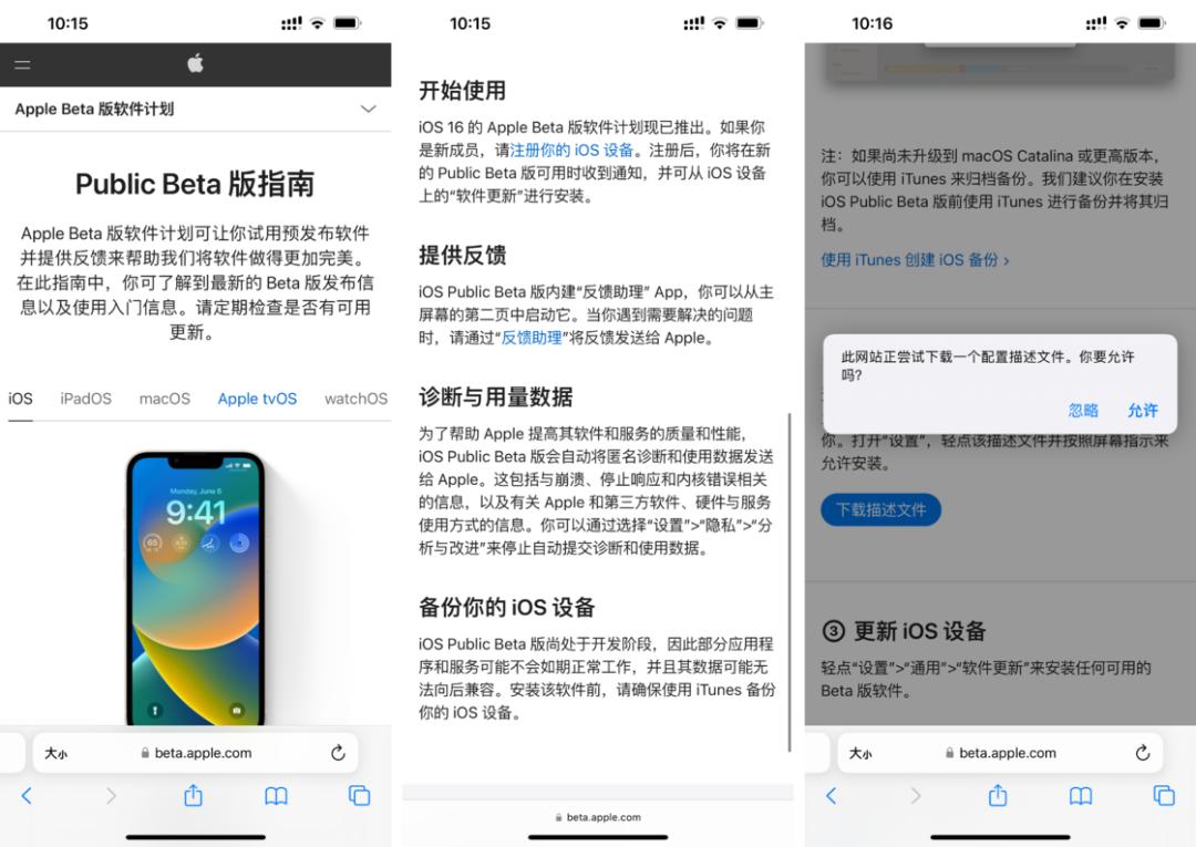 之后,在 iOS 的 Public Beta 页面中下载描述文件,系统会提示安装配置描述文件,点击「允许」。