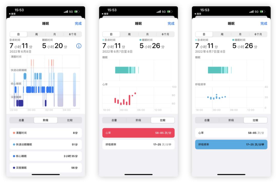iOS 16 的健康 App 整体设计没有变化,主要追加了两项新的功能,分别是睡眠分析和用药提醒。新版本的睡眠分析不再只是总时长的统计,还加入了睡眠阶段的详细分析,包含清醒时间、快速动眼睡眠、核心睡眠、深度睡眠五个阶段。与此同时,还会记录睡眠期间的心率波动以及呼吸频率的数据信息。