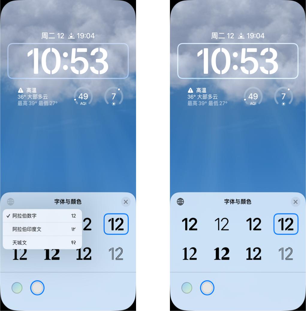 中间时间部分,Apple 不仅调整了占位大小,还提供了阿拉伯数字、阿拉伯印度文、天城文三种文字,每种文字包含了多种不同的设计。针对色彩部分,你可以在最下方选择背景适配色彩,也可以选择纯白色。