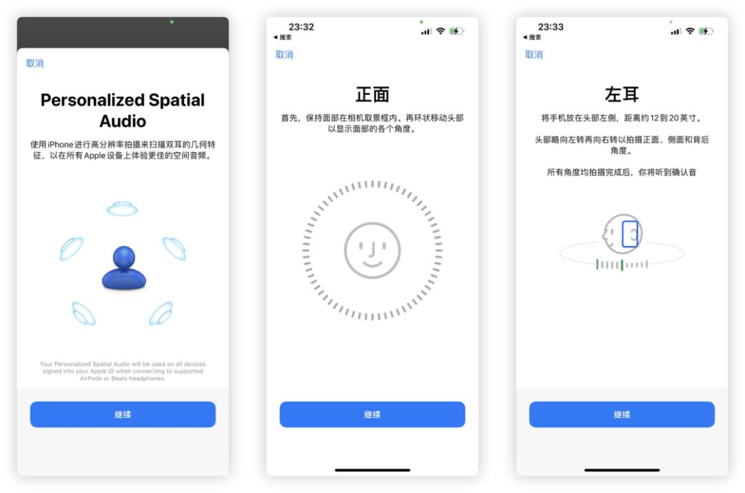 iOS 16 中,Apple 再一次优化了空间音频的体验。当你首次设置 AirPods 系列产品时,系统会自动提示将为你定制个性化的空间音频,然后会通过 Face ID 对你的面部以及左右耳进行扫描,在系统中生产属于你专属的几何特征,然后对空间音频进行个性化的适配。(个人觉得目前没有听出太大的区别)
