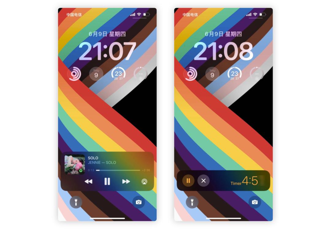 此外,锁屏的通知还加入实时活动,这样一来你就可以更快地在锁屏了解到一些正在发生的事情,比如外卖、比赛、健身等等。目前暂时只有倒计时和部分音乐 App 支持实时活动显示,其余的第三方暂未支持,Apple 表示相关 API 将在今年晚些时候对开发者开放。