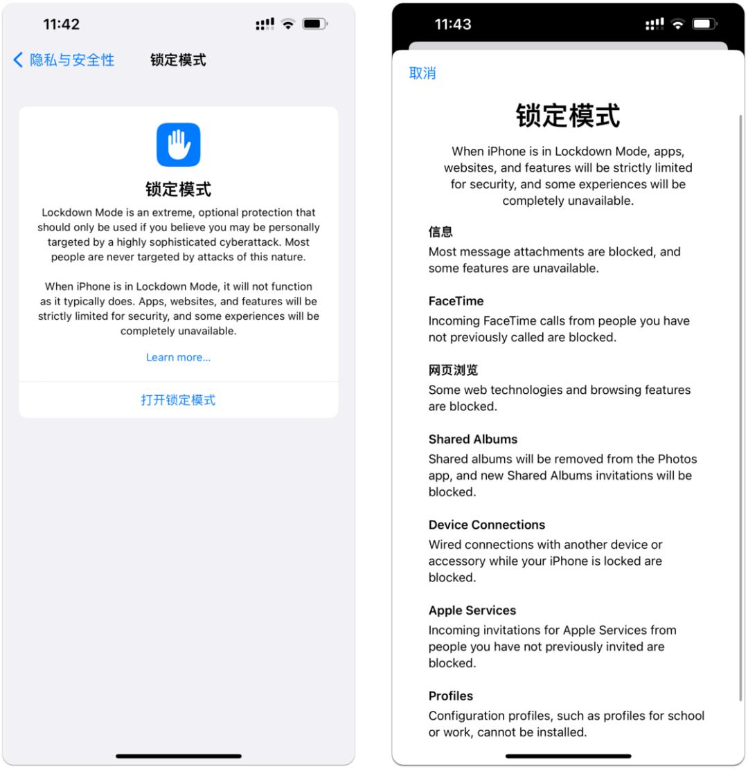 在 iOS 16 中,Apple 推出了名为「锁定模式」的新功能,我们可以在「隐私与安全性」>「锁定模式」中打开它。