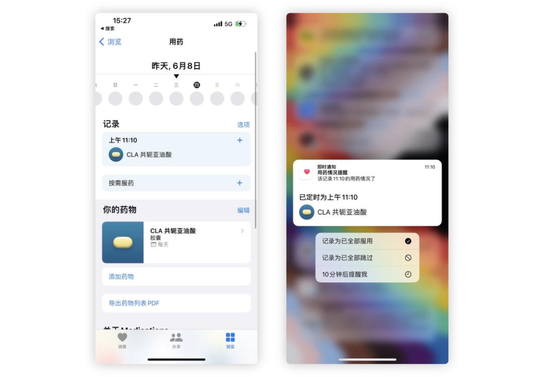对于有日常药物服用需求的用户,可以在「健康」>「浏览」>「用药」中设置并管理自己日常药物。设定好药品和服用时间后,iOS 可以按时提示你去服用药物,并记录服药记录。此外,还支持一键导出自己的药品清单,方便购买时使用。