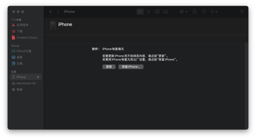 接下来,Finder 或 iTunes 会检测到你有一台处于恢复模式的设备,并询问你是否要恢复或更新设备。