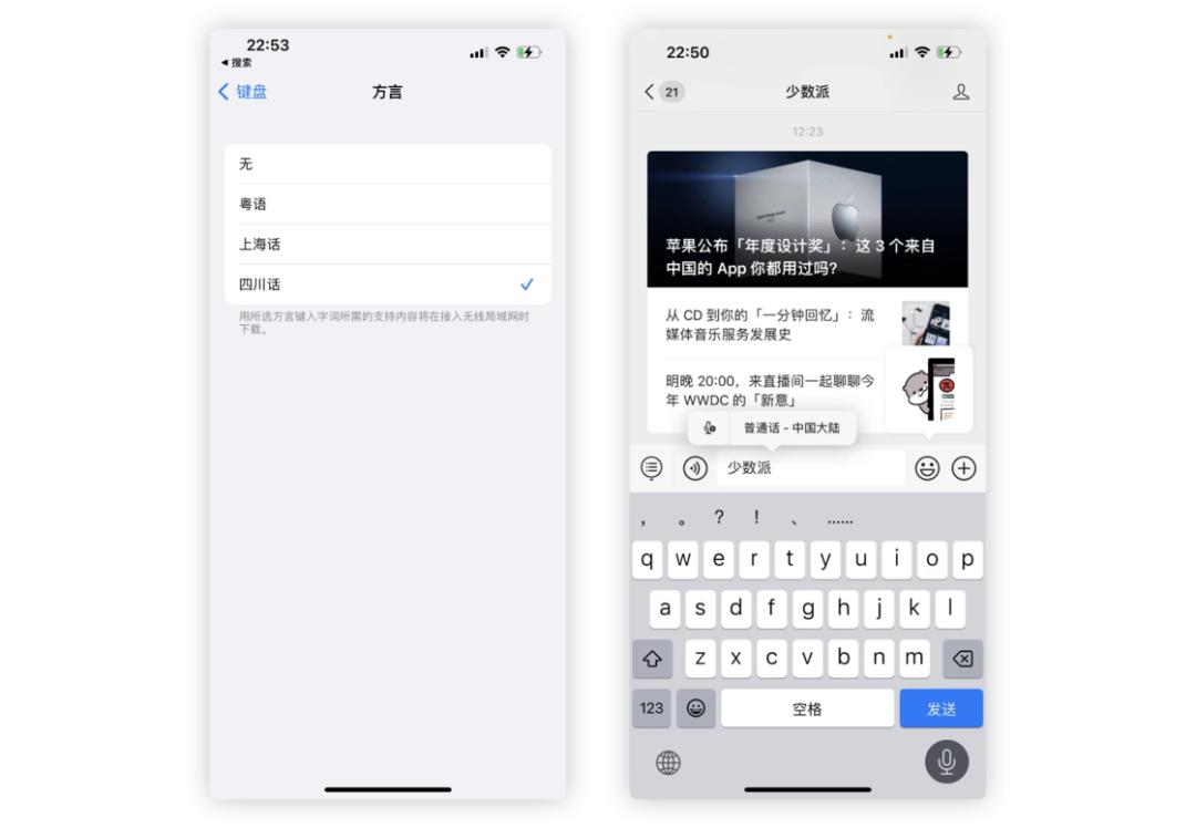 键盘方面,针对拼音输入追加了四川话的选项,可以通过「设置」>「通用」>「键盘」>「方言」进行查看。此外,手动输入和语音输入可以同时执行了。这样一来,即使说错了内容,也可以快速用键盘进行手动修改,无需来回切换输入模式。