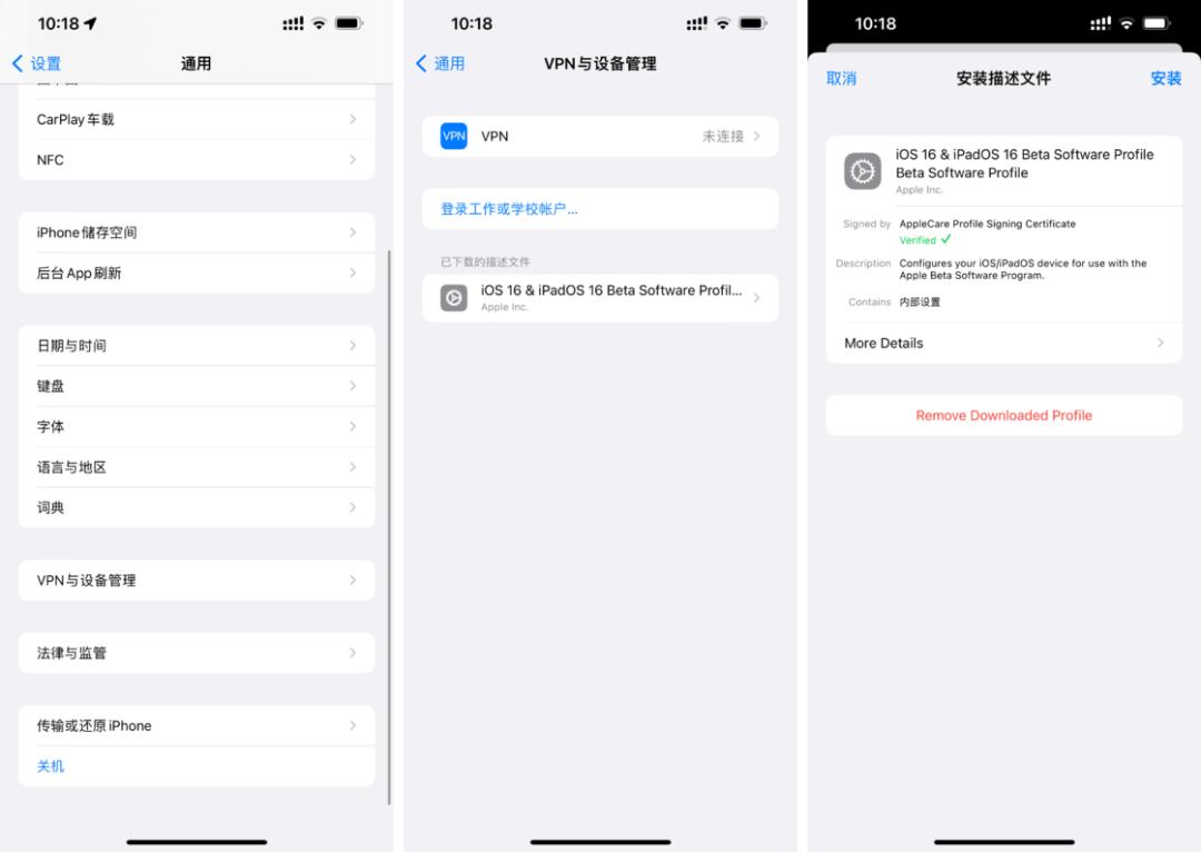 在系统设置中找到「通用」>「VPN 与设备管理」选项中,选择刚刚下载的描述文件,点击「安装」,输入设备锁屏密码并同意安装协议,重启你的 iOS / iPadOS 设备。之后,你就可以在「设置」>「通用>「软件更新」中更新设备了。