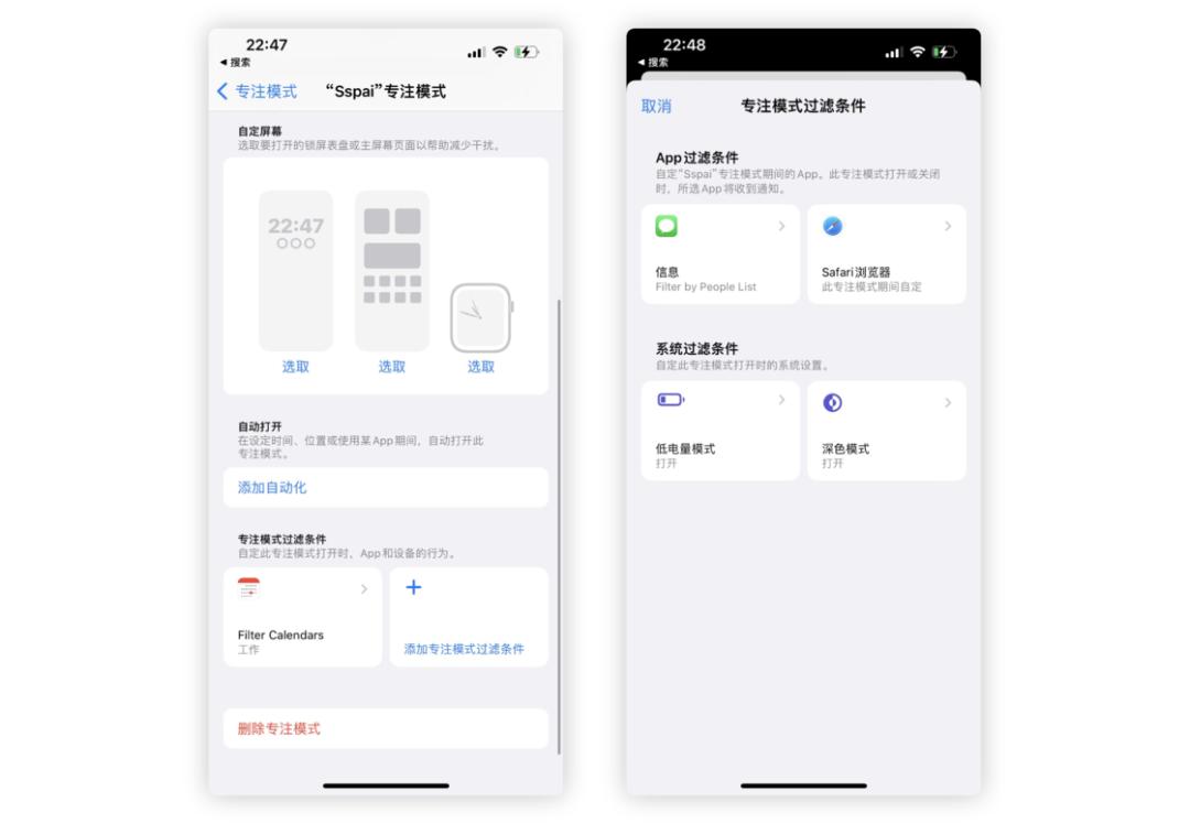 此外,这次 Apple 还提供了一项专注模式过滤条件。在这里你可以针对日历、信息、浏览器、低电量模式、深色模式进行更加细致的设定。例如,当相应的专注模式开启时,日历会会被筛选,其余的日历无法查看,系统会自动开启等等。这样一来,专注模式的功能变得更加自动化、更加个性化。相信在以后的更新中,专注模式应该可以做到更多的事情。