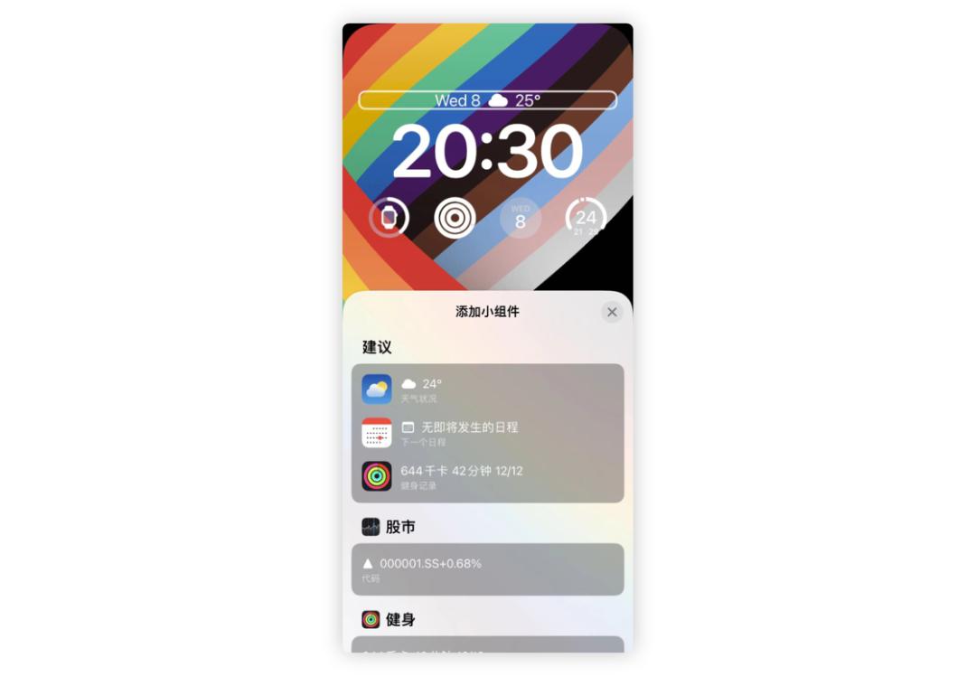 本次锁屏的变动主要围绕着个性化进行展开。时间的上下部分都被 Apple 定义为了小组件区域,上部以单行图标配文字的形式进行展现,你可以根据自己的需要选择日历、股市、健身、时钟、天气五个原生类目。