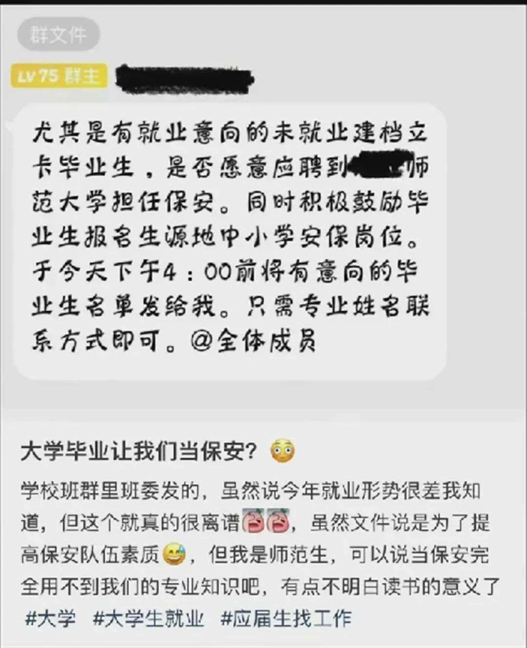对于校方做法,学生狠批道:不上大学我当保安,上了大学我还当保安,这大学,我是白上了吗?