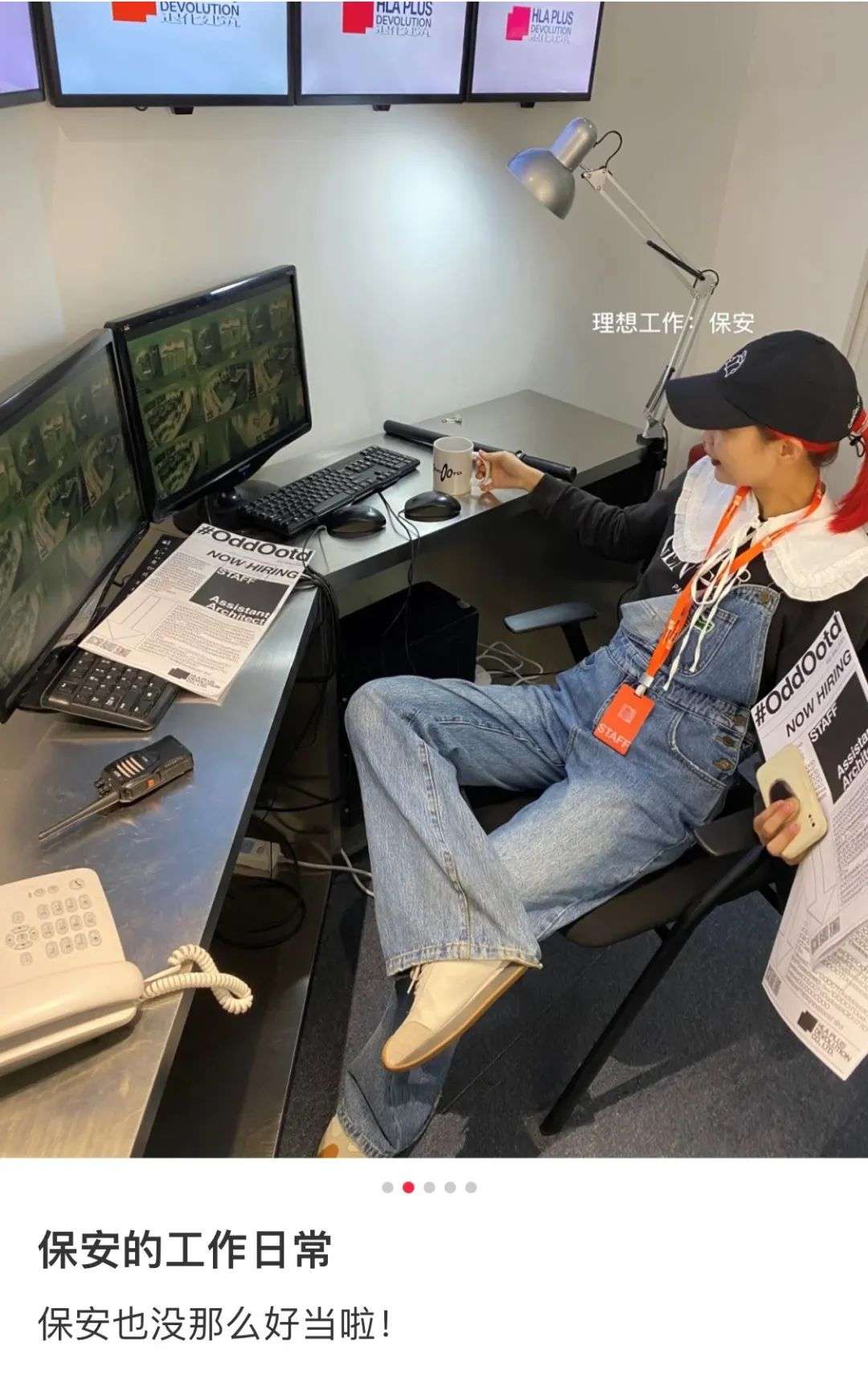 他们坐在监控器前,拍了几张照片记录,给保安贴上理想工作的标签。