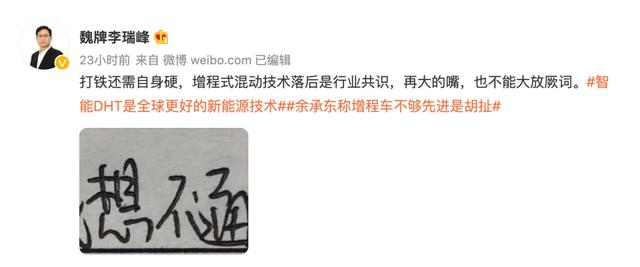这引发了魏牌CEO李瑞峰在微博上的反对:增程式混动技术落后是行业共识,再大的嘴,也不能大放厥词。之后李瑞峰再次发博重申自己的观点“增程式就是落后的,隔行如隔山,别把随性当个性。”