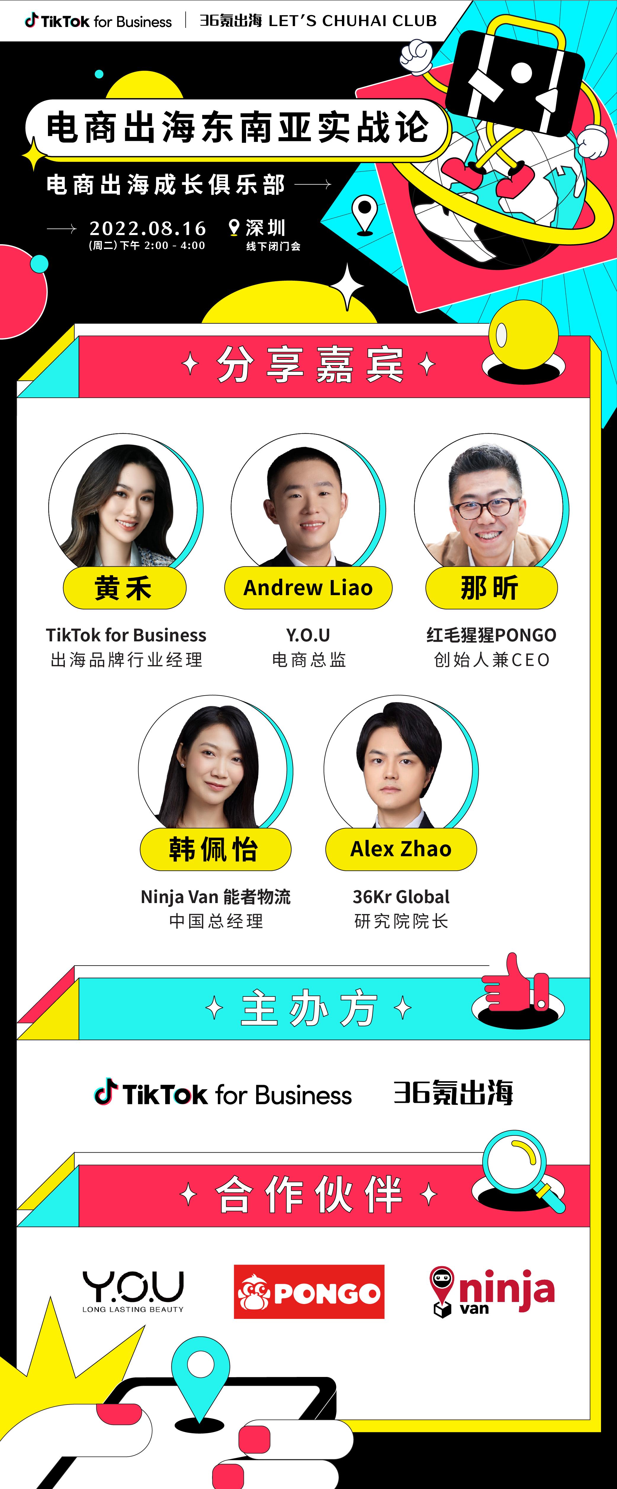 8月16日(周二),36氪出海携手TikTok for Business,将在深圳举办线下闭门分享会活动。在这座跨境电商的“大本营”,我们同时邀请到风靡东南亚的美妆个护品牌Y.O.U、以内容为核心的跨境营销服务商红毛猩猩PONGO、东南亚物流独角兽Ninja Van能者物流,与关注东南亚市场的中国跨境品牌一道,探讨东南亚零售电商市场机遇。从海外市场的成功经验,到广告、营销、物流等服务环节,我们希望用“实战论”,为中国跨境电商出海的每一步保驾护航。