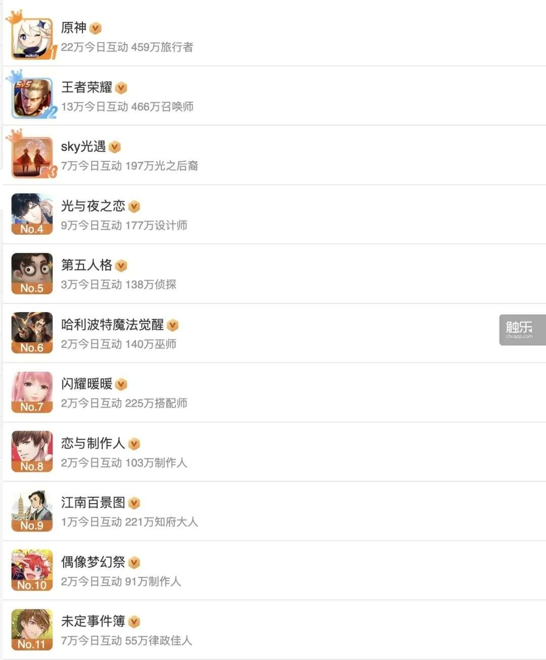 那为什么国乙玩家的声浪显得特别突出,又容易“出圈”呢?除了国乙玩家本身已经是一个非常庞大的用户群之外,路先生提出了一个业界观察到的现象:“现在很多事儿是在微博上出现的,不管是在游戏还是娱乐领域,微博都是以女性用户为主,其中超话又占领了微博的主要阵地。”搜索一下微博上的超话排名,确实能看到男明星和女明星的超话,在热度上可能会差出一个数量级——顶级流量的女明星,微博数据很难与相同“咖位”的男流量相比。在游戏领域也是如此,某个女性向游戏,哪怕流水和用户量在所有游戏之中处于中等偏下水平,它的超话还是能在综合排名中名列前茅。平台用户的聚集性一定程度上可能助长了他们的声量。