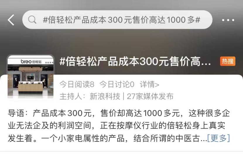 对按摩仪行业来说,毛利率高可不是一件好事,这意味着在技术平庸的情况下,品牌拉高了产品售价。 此前“倍轻松成本300元售价高达1000多”的话题还登上过热搜,引发网友对智商税的讨论。