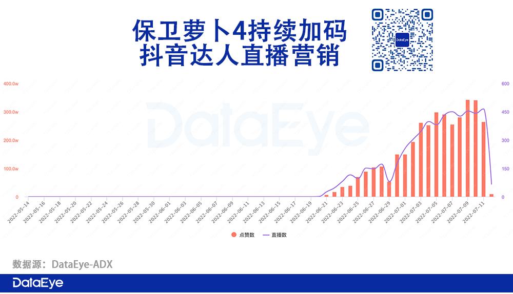 虽然同样拥有IP,但不同于ohayoo出手百万的阔绰,《保卫萝卜4》在营销方面更加“节俭”——DataEye-ADX数据显示,其买量极少,几乎没有效果型达人视频,而是把营销的重心,放在效果型达人直播。