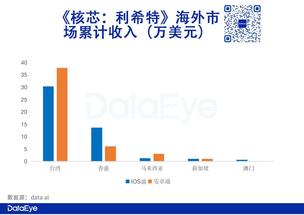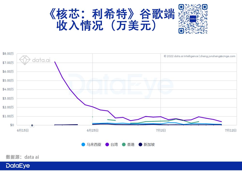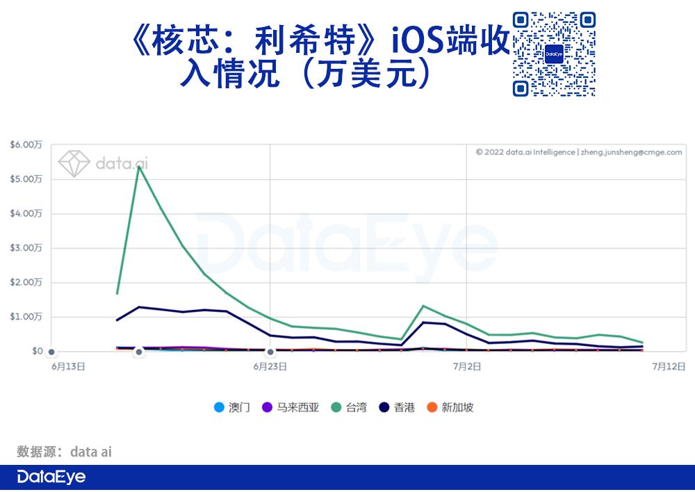 《核芯:利希特》游戏于6月16日上线中国港澳台、马来西亚、新加坡,上线首日就在中国台湾iOS游戏免费榜拿下第一的成绩。然而,近一个月收入表现比较一般,累计收入约94.27万美元,折合约634.43万人民币。