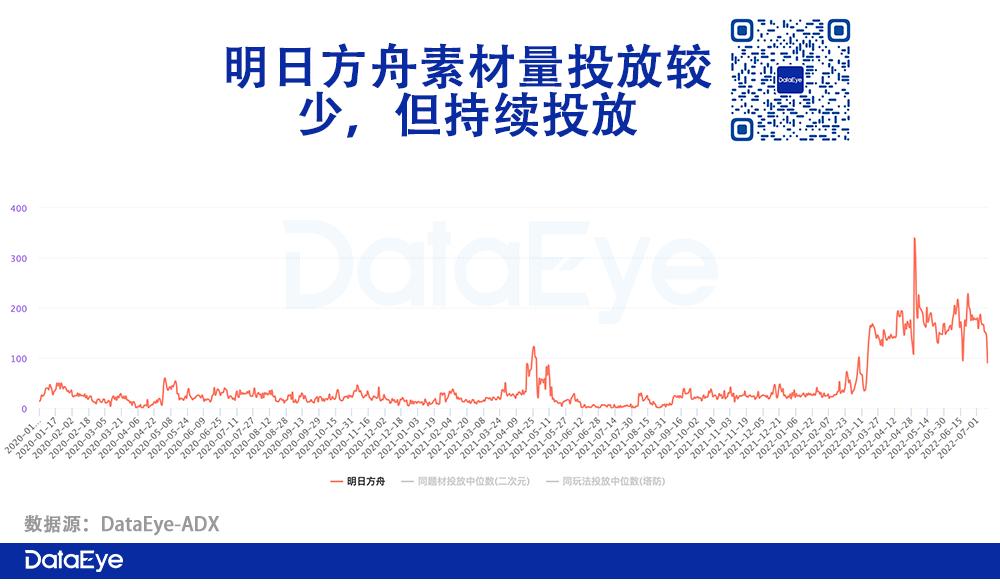 素材量方面,《明日方舟》一直维持低频、持续投入,仅在2022年才开始加大力度,但总体素材量并不多,是典型的二次元游戏“小而美、长线化”的思路。