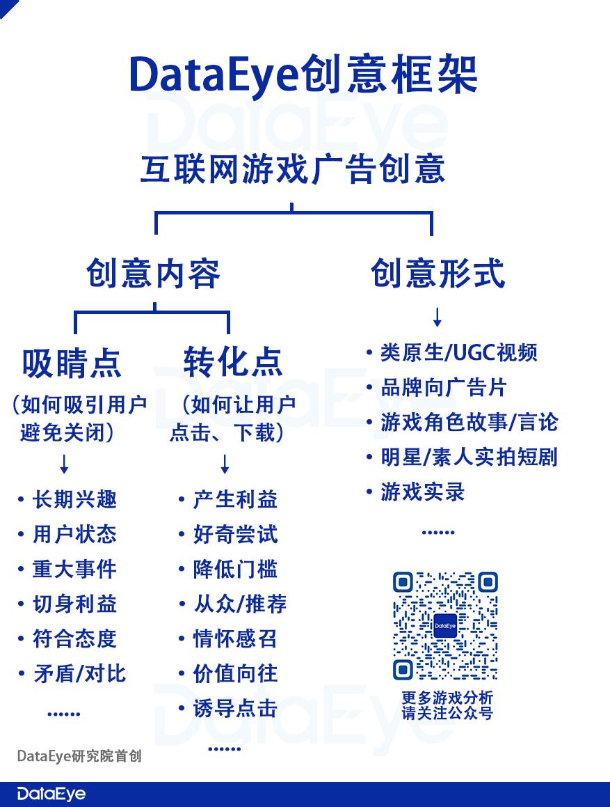 以下,针对高效创意素材的分析是基于DataEye研究院独创的“DataEye创意框架”。(以下分析,样本以游戏最多计划数TOP15和投放天数TOP15,共30支高效买量短片)