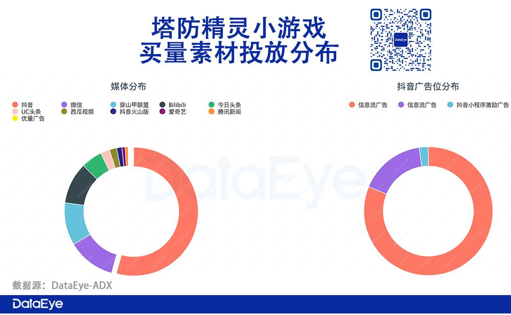 《塔防精灵》小游戏产品表现出色,因此项目组侧重于在字节系平台与其他手游APP“同台竞争”,虽然可以整体流量更大,但买量成本也随之提升。而在微信端投放,小程序激励广告占比更高,侧面说明该广告位转化或较优。